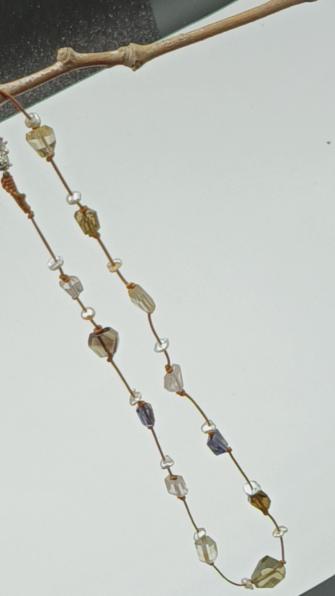 Collar Kali Perla de la colección Atenea, con Piedra facetada intercalando chips de Perla en cuero natural y cierre joya.