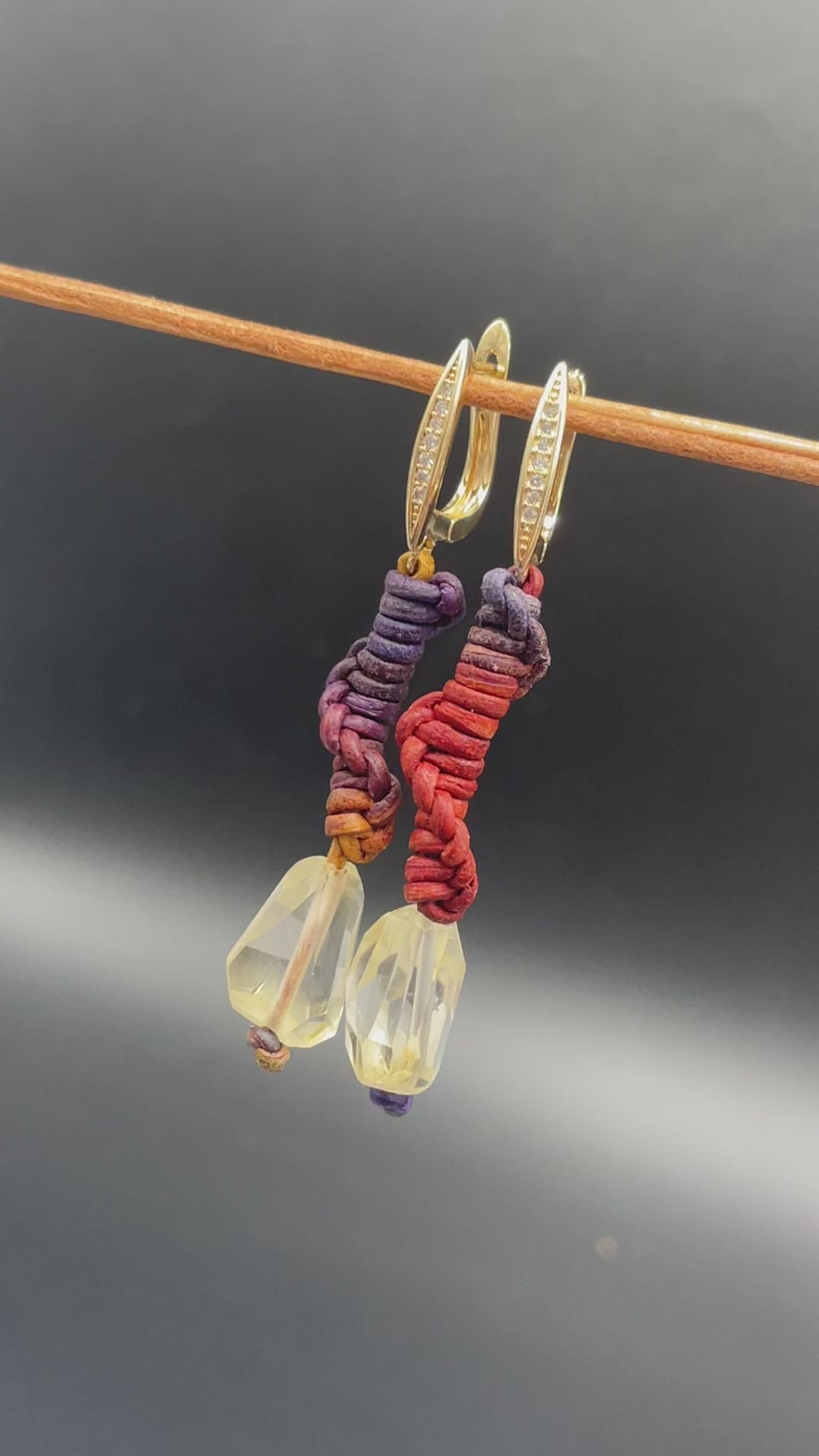 Pendientes de la colección Espiral con Citrino. Cuero tintado degradado, con cierre bañado en plata | bañado en oro 18k. Largo aproximado a 4 cm.